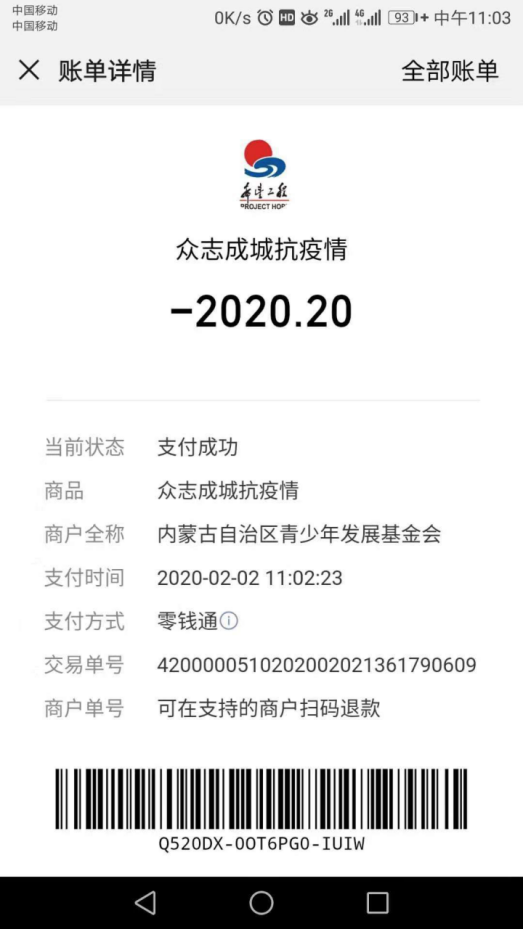 张静说:因为我们学校的老师一直都是这样做的,很难不受他们影响,总有人这时候比我更需要帮助。张静觉得2020是新的一年,2月2日又是一个月的开端,所以她选择在这一天向内蒙古自治区青少年发展基金会捐献2020元用于抗击疫情,向所有奋战在一线的医务人员及白衣天使们致敬,希望早日战胜病毒,中国加油!武汉加油!