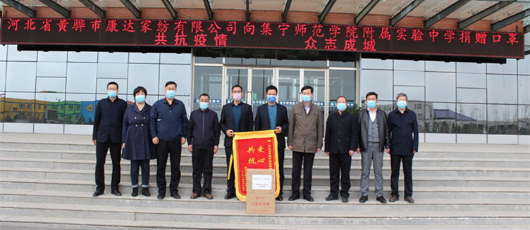 4月14日下午,河北省黄骅市康达家纺有限公司代表,来到集宁师范学院附属实验中学滨河校区,将1000只一次性防护口罩捐赠给了学校。他们表示,听说学校复课,一直想为学校师生做点力所能及的事,捐赠这批口罩虽数量有限,但表达的是他们的一份心意。