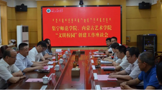 下午,刘春一行与内蒙艺术学院党委书记刘前贵,党委副书记赵海忠,相关职能部门负责人和部分二级学院负责人进行了座谈交流。双方就文明校园创建工作进行了深入交流探讨。内蒙古艺术学院党委书记刘前贵和党委副书记赵海忠对集宁师范学院“文明校园”创建工作颇为关切,两位老领导向刘春一行表示热烈欢迎,向集宁师范学院全体教职工表示深切问候,并衷心祝福集宁师范学院“文明校园”创建工作早日取得成功。内蒙古艺术学院党委委员、宣传部部长王锦文介绍了内蒙古艺术学院“文明校园”创建工作重点和难点,相关职能部门和二级学院党总支书记分享了创建工作中的好的做法和先进经验。