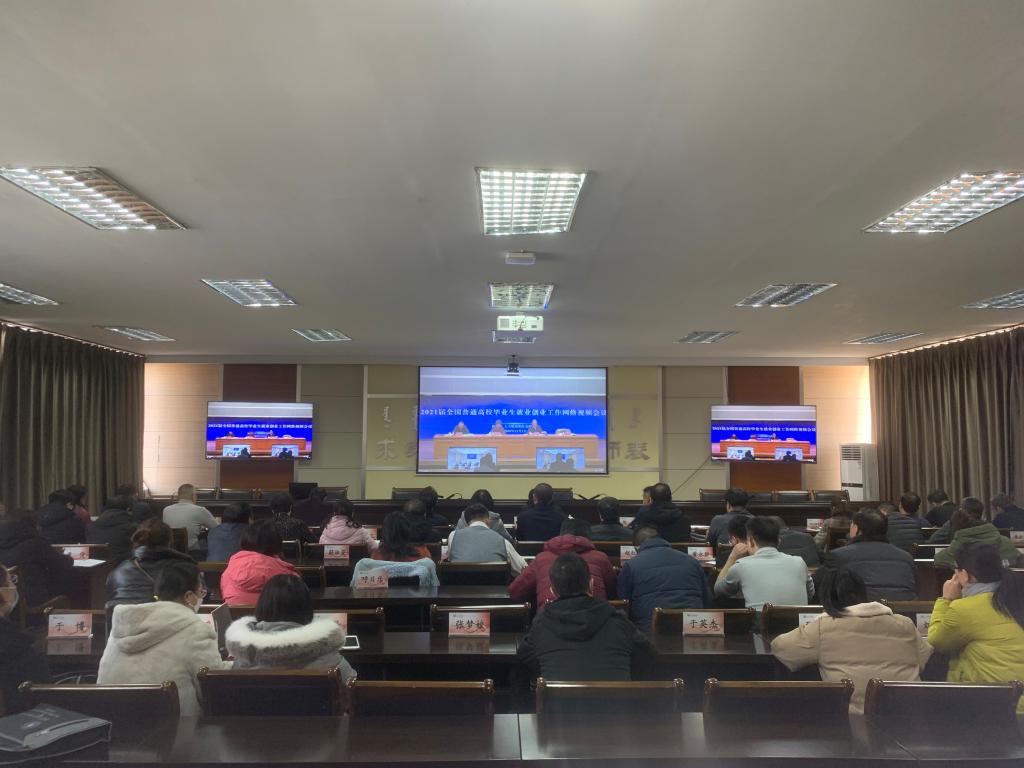 12月1日,教育部、人力资源社会保障部在京召开2021届全国普通高校毕业生就业创业工作网络视频会议,深入学习贯彻党的十九届五中全会精神,部署做好2021届高校毕业生就业工作。教育部副部长翁铁慧、人力资源社会保障部副部长李忠出席会议并讲话。集宁师范学院在行政楼5楼会议室设立分会场,自治区教育厅就业指导中心副主任王清,集宁师范学院党委副书记、校长李树林,党委副书记刘春,党委委员、副校长梁政,各相关职能处室和各学院领导班子成员、负责就业的相关工作人员以及全体毕业班班主任、辅导员,共82人参加了会议。