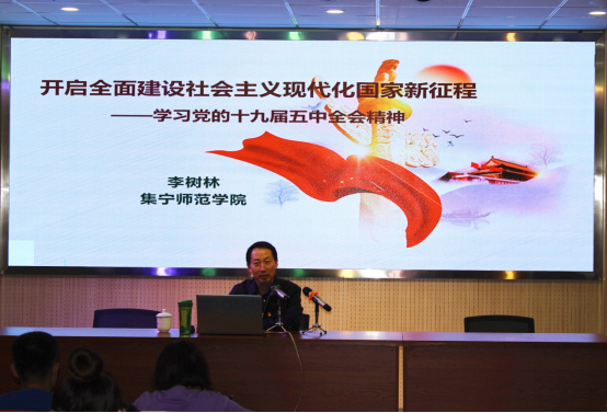 12月18日,集宁师范学院党委副书记、校长李树林在白海校区报告厅为联系班级蒙古学学院2019级学前教育(蒙授)1班、经济与管理学院2019级财务管理1班和2019级老年服务与管理1班作党的十九届五中全会精神宣讲。
