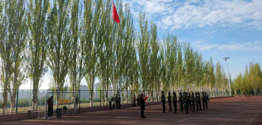 伴着鲜红的朝阳和雄壮的《中华人民共和国国歌》,五星红旗冉冉升起,迎风飘扬,在场的每一个人向国旗行注目礼,深情地表达对祖国无限的热爱和崇高的敬意!