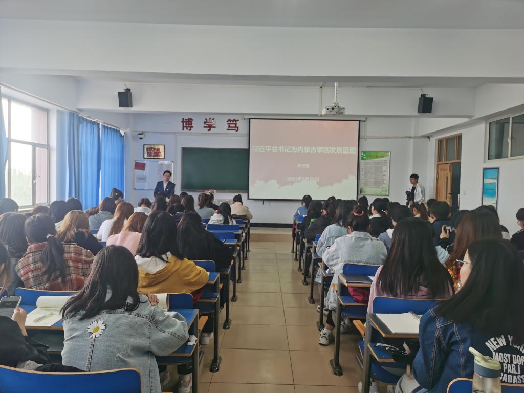 5月26日上午,集宁师范学院党委书记朱玉东为2020级英语专业2班、4班同学讲授《铸牢中华民族共同体意识》课程第八讲“习近平总书记为内蒙古擘画发展蓝图”内容。