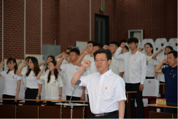 迎百年华诞,为信仰立誓。6月30日下午,集宁师范学院在泉山校区图书馆报告厅隆重举行2021年新发展预备党员入党宣誓仪式。党委书记朱玉东出席仪式。各二级学院党总支书记、附中党总支书记、学工党支部书记和240名新发展的预备党员参加宣誓仪式。党委组织部副部长刘晓霞主持仪式,党委书记朱玉东领誓并作讲话。