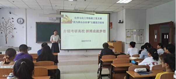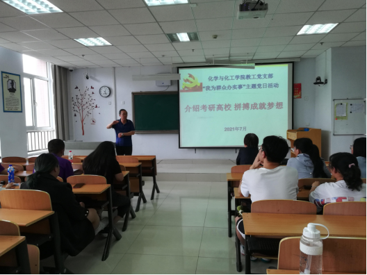 最后化学与化工学院党总支书记李荣为本次党日活动做了总结性讲话。他表示,在中国共产党成立一百周年之际,根据党史学习教育工作要求教工党支部开展此次“我为群众办实事”主题党日活动是真正从学生的所需所想出发,为学生办实事,有助于提高考研率,实现学生的高质量就业,推动学院和学校的转型发展和内涵式建设;各位老师认真准备和讲解各高校的相关材料,与同学们深入交流,充分体现了党员同志们始终坚持为民服务的宗旨,能够密切联系学生,敢于担当尽责;同学们通过本次党日活动对区内外各高校的情况有了深入地了解,也明确了考研学习的努力方向,希望同学们通过不懈努力与拼搏,能够考上自己理想学校的研究生,成就梦想,最终成为新时代中国特色社会主义建设有用的人才,为实现中华民族伟大复兴的中国梦而不懈奋斗。