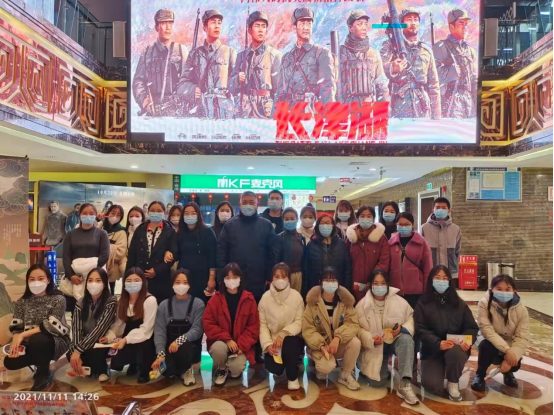 为进一步推动党史学习教育,深切缅怀革命先辈,弘扬爱国主义精神。结合学校党史学习教育工作安排,文学与新闻传播学院于11月11日下午组织全体师生党员在奥威国际影城观看主旋律电影《长津湖》。