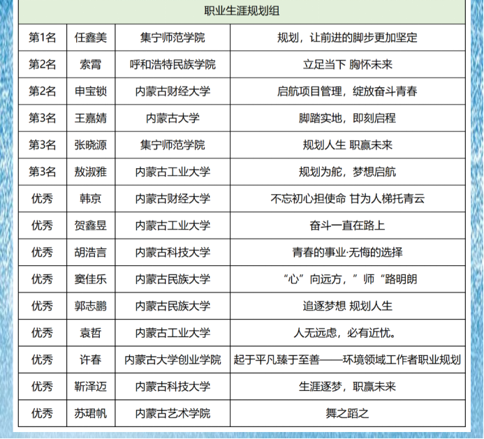 在职业生涯规划组,我校学生任鑫美《规划,让前进的脚步更加坚定》获第一名、张晓源《规划人生职赢未来》获第三名。