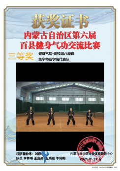因疫情因素,本次赛事采用了线上参赛、线下评审的模式,参赛项目为国家体育总局健身气功管理中心推广的缩短版功法:传统健身气功·八段锦、易筋经、五禽戏和新功法大舞、导引养生功十二法、健身气功·马王堆导引术、太极养生杖等项目。我校参赛队员在比赛当中随着音乐,形、体、意、气相互配合,动作中正,刚柔并济,行云流水,最终在集体赛中新功法大舞荣获二等奖,健身气功·八段锦荣获三等奖的佳绩。