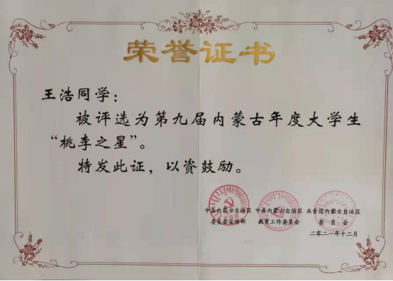 在学习方面成绩优异,综合测评每学期都在班级前三,并得到多位任课老师的认可,在大学期间荣获励志奖学金、国家奖学金以及乌兰夫奖学金,在考研的路上也如愿以偿,被内蒙古科技大学拟录取。