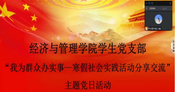 3月17日,经济与管理学院学生党支部组织全体党员通过线上开展了以“我为群众办实事—寒假社会实践活动分享交流”为主题的党日活动,本次活动由学生党支部书记王婉主持。
