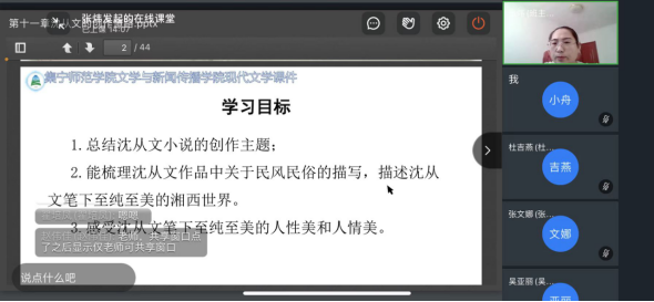 张炜老师讲授的是《沈从文的创作道路》。课堂上,张老师教学设计思路清晰,学习目标明确,整节课循循善诱,利用分组PK的形式,通过提问法、讲授法、讨论法、分析法等教学方法,引导学生走近沈从文,走近他的湘西世界,感受沈从文作品的人性美、人情美;引导学生在阅读作品时,运用叙事视角、叙事语言分析作品,体会“民族性格重铸”既是京派的核心,也是沈从文小说的重要命题。