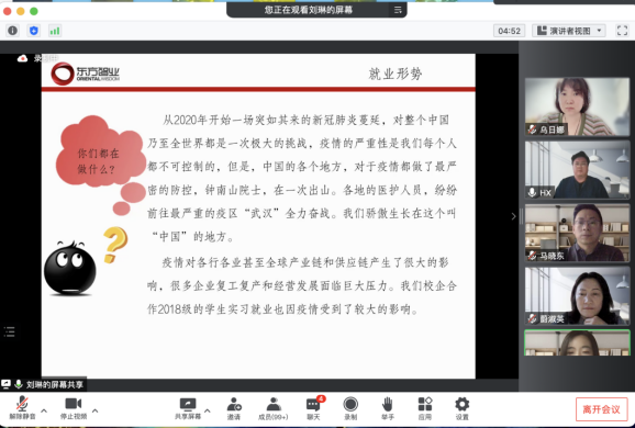 其次,合作办学企业方代表东方智业的刘琳老师为毕业生分析就业现状和择业准备工作如何开展。