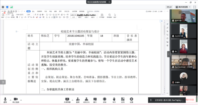 为了丰富学生在疫情防控条件下线上教学的业余生活,培养和历练学生在专业能力上的创新思维和理念,四月初,学院就安排了以“专业创新”为主题,即学生根据自己的专业和专业特点:音乐学2018级专业以《课程教学创新》、2019级以《教学与教案设计创新》;2018和2019级音乐表演专业以《主题晚会创新设计》为内容的创新活动,经过班级组织初赛后,于5月26日下午,以专业和初赛成绩,分11个小组,按不同层级在线上集体组织了决赛,学院全体教师分组参加比赛。
