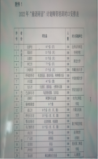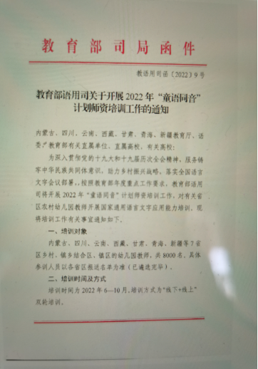 为深入贯彻党的十九大和十九届历次全会精神,服务铸牢中华民族共同体意识,助力乡村振兴战略,落实全国语言文字工作会议部署,按照教育部年度重点工作要求,教育部语用司组织开展2022年“童语同音”计划师资培训工作。经过前期认真组织、积极申报,我校国家语言文字推广基地被遴选为培训单位,培训工作将于2022年6月-2022年10月进行。