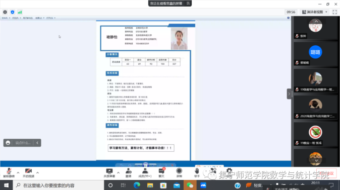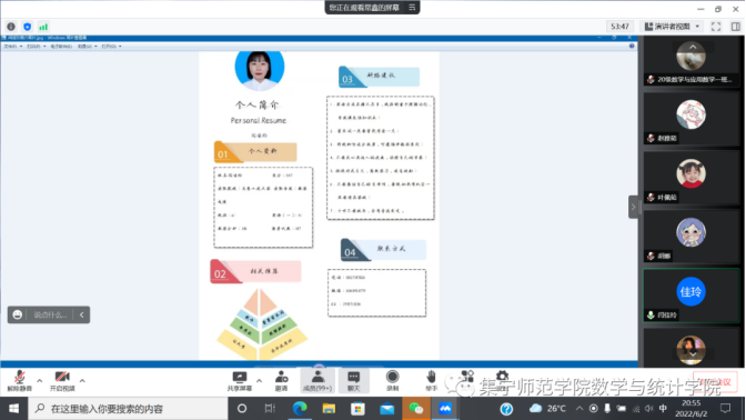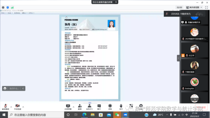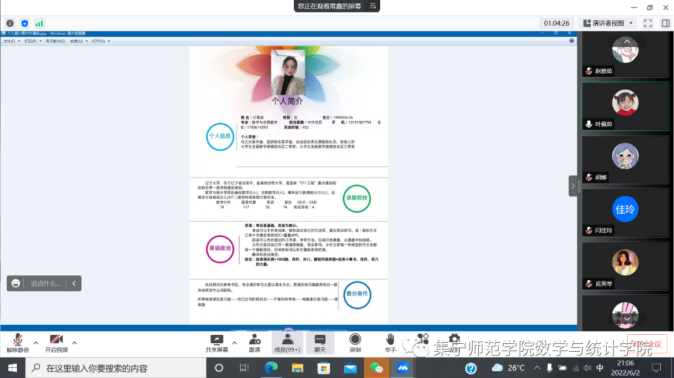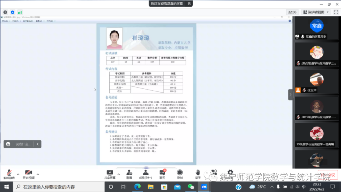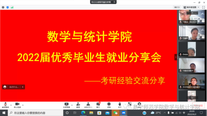 为了帮助我院毕业生进一步了解就业知识,明确就业方向,更好地帮助同学们解决在就业过程中遇到的各种问题,集宁师范学院数学与统计学院于6月2日、6月8日开展2022届优秀毕业生就业经验交流分享会。
