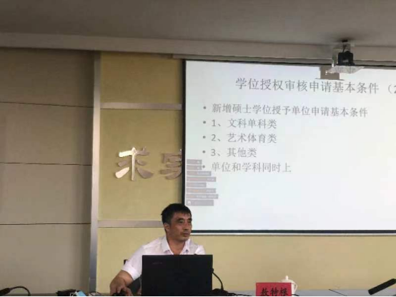 20日上午,呼伦贝尔学院副校长敖特根教授应邀做了题为“新增硕士学位授权单位与授权点的思考”的专题报告。敖特根教授就学位授权审核申请基本条件进行了详细的解读,具体介绍了呼伦贝尔学院在申硕工程中的成功经验。并结合我校发展情况对申硕当前形势、重点任务、学科资源整合、特色凝练、材料撰写等方面进行了有针对性的指导。