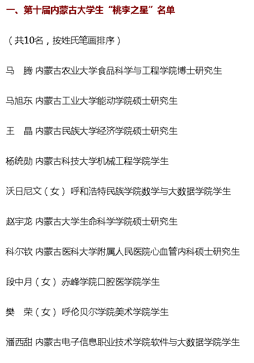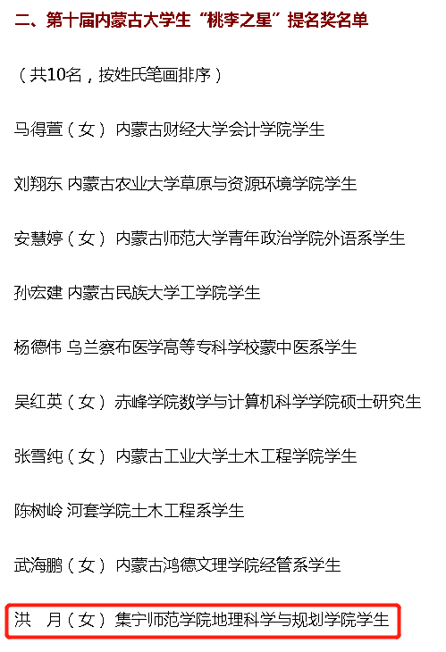 根据《关于开展第十届内蒙古大学生“桃李之星”选树活动的通知》(内党宣发电〔2022〕14号)有关要求,经评选及研究,6月8日,第十届内蒙古年度大学生“桃李之星”名单及提名奖名单出炉。我校地理科学与规划学院学生洪月(女)入围“桃李之星”提名奖公示名单。