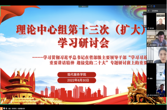 8月30日集宁师范学院现代服务学院党总支组织召开第十三次理论学习中心组(扩大)学习研讨会,学习贯彻习近平总书记在省部级主要领导干部专题研讨班上重要讲话精神。校党委书记朱玉东巡听本次学习研讨会。会议由学院党总支书记李荣利主持,学院理论学习中心组全体成员并扩大到环节干部及全体党员参加了会议。学习研讨会首先由现代服务学院院长王汉君领学讲话精神,随后老教授老党员代表黄中,党总支副书记李贞,教师党支部书记王晓玉,教学科研科科长张旭虹,农工党、党外知识分子代表刘小番,归国留学教师代表沈佳雯分别就讲话精神进行了交流研讨。