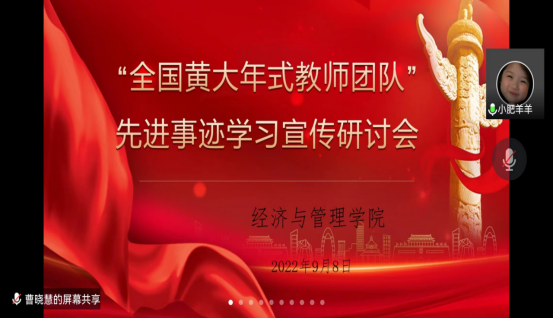 9月8日,经济与管理学院组织全体教师开展“全国高校黄大年式教师团队”先进事迹集中学习研讨会,会上集中观看了“黄大年式教师团队”系列直播,高爱萍,田阳等几位教师积极发言,结合本职工作畅谈了学习心得体会。会议由经济与管理学院党总支副书记苗雯娟主持。