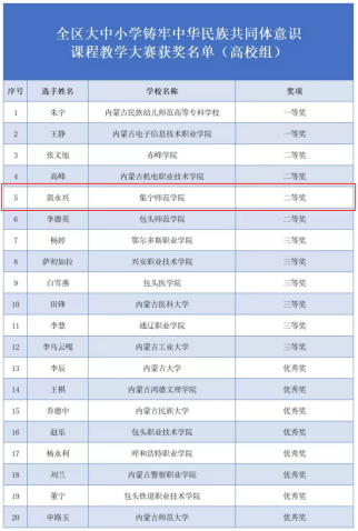 来自全区各盟市和高校选拔推荐的58名大中小学思政课教师进行激烈角逐,最终,集宁师范学院马克思主义学院教师郭永兴荣获二等奖,集宁师范学院荣获优秀组织奖。