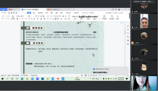 9月30日,地理科学与规划学院与西安航天宏图信息技术有限公司共同举办了实习线上面试活动,副院长暴向平主持活动,2019级人文地理与城乡规划班33名学生参加了面试。面试过程中,学生就个人在校期间学习内容、实习情况进行了自我介绍,并针对本次实习需求做了相关作品展示,表达了个人的实习意愿及对未来的展望。
