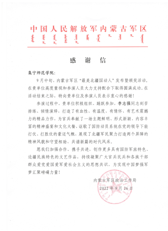 9月中旬,内蒙古军区政治工作局向我校发来感谢信,信中对我校积极组织、踊跃参与“最美北疆国动人”发布暨颁奖活动表示感谢,对我校参演人员化学与化工学院2022级应用化学专升本一班李志强同学的表现给予充分肯定。
