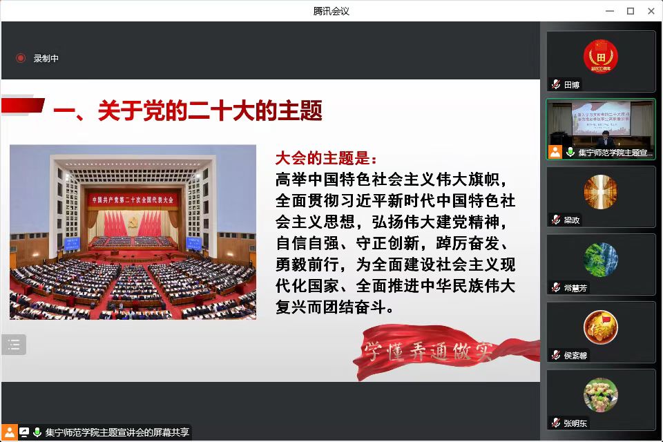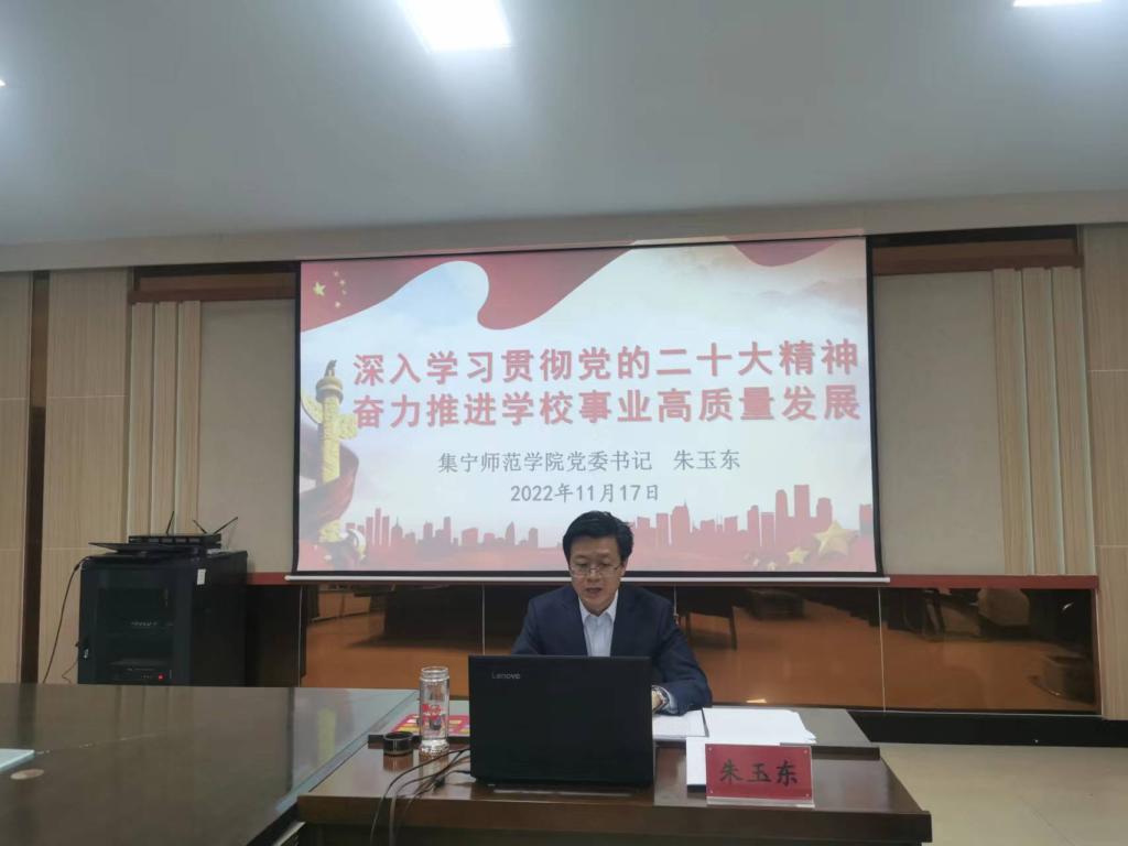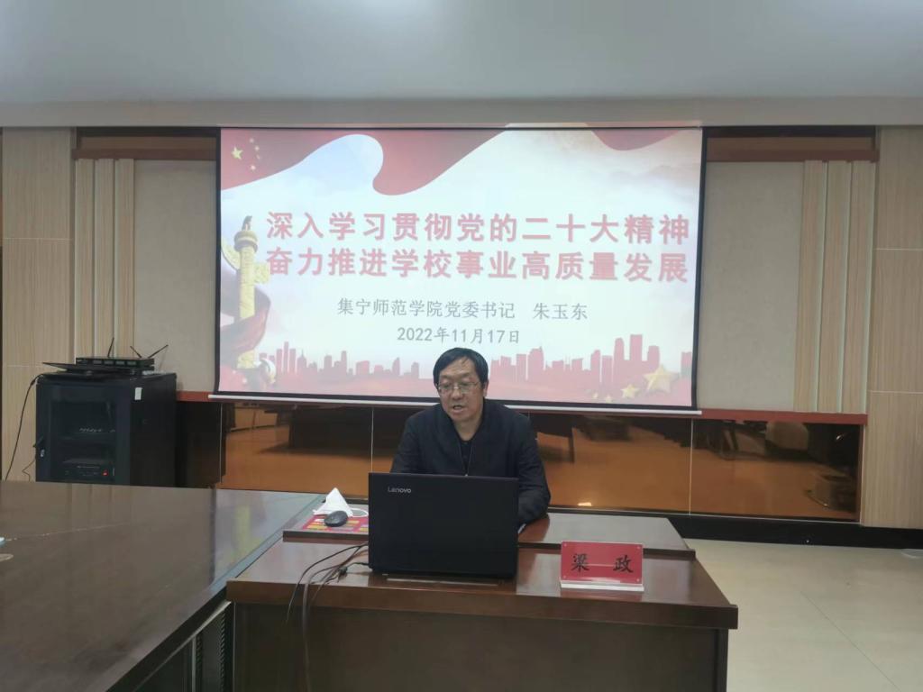 为深入学习宣传贯彻党的二十大精神,根据校党委统一安排,11月17日下午,集宁师范学院以线上形式召开党的二十大精神宣讲报告会,校党委书记朱玉东以“深入学习贯彻党的二十大精神 奋力推进学校事业高质量发展”为题作宣讲报告。党委副书记梁政主持报告会,全体校领导、党委委员,全校副处级以上干部,各二级学院师生代表聆听了报告。