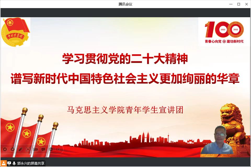 12月8日,集宁师范学院马克思主义学院通过线上方式举行“党的二十大精神青年学生宣讲团”宣讲培训会。马克思主义学院党总支副书记、院长杨明霞,党总支副书记胡志胜,团总支书记吕红及宣讲团全体成员参加会议,学团办主任郭永兴主持会议。