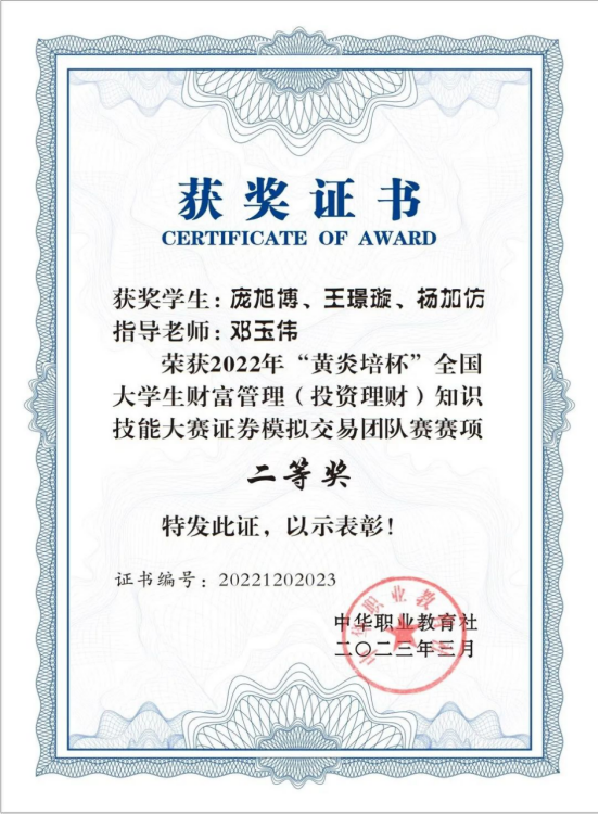 2022年“黄炎培杯”全国大学生财富管理(投资理财)知识技能大赛于2022年底顺利闭幕,本届大赛共有来自全国九十多所高校的364支战队参赛。经校内选拔,我校共选派两支团队参加证券模拟交易团队赛,其中我校经济与管理学院的王璟璇、杨加仿和庞旭博三位同学在邓玉伟老师的精心指导下通力合作,与其他院校经过30个交易日的激烈角逐和决赛答辩,最终荣获团队赛全国二等奖的佳绩。