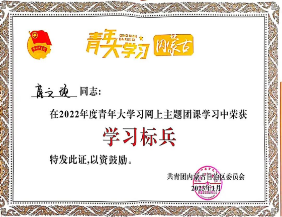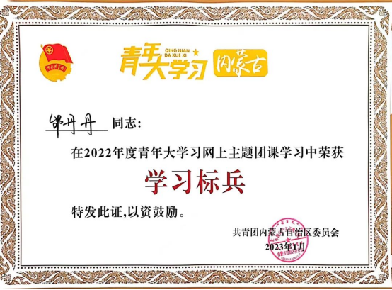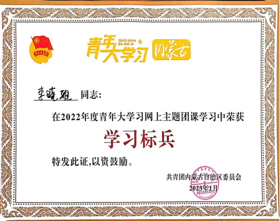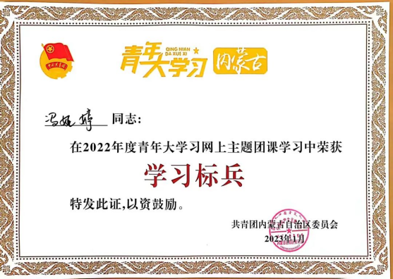 近日,共青团内蒙古自治区委员会公布了2022年度“青年大学习”网上主题团课学习标兵的名单,我校学生唐文硕、李晓雅、冯娅婷、邰丹丹、王凤春在2022年度青年大学习网上主题团课学习中荣获“学习标兵”的荣誉称号。
