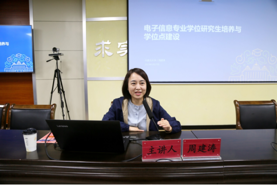 周建涛教授着眼于硕士学位点的申报与建设,从电子信息专业学位的发展历程、专硕与学硕的区别、学位点建设等方面,立足我校实际情况,对硕士点建设中的研究方向、科研项目的突破、科研成果的提升、实验室建设及校企合作等方面进行了针对性指导,提出了可行性建议和意见。