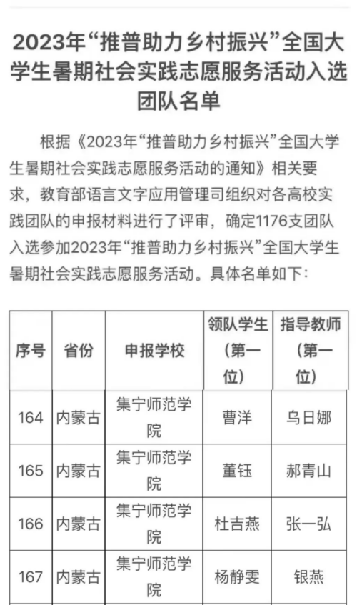 我校有四支队伍成功入选。下一步入选团队将按照教育部语用司部署积极参加2023年“推普助力乡村振兴”全国大学生暑期社会实践志愿服务活动。