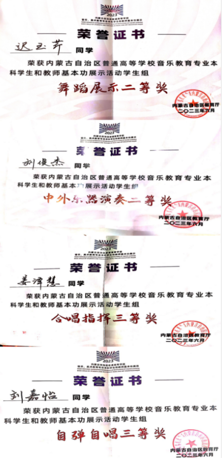 经过激烈角逐,2022级音乐学(专升本)班学生迟玉琴获舞蹈单项“二等奖”;2022级音乐学(专升本)班学生刘俊杰获得中外器乐演奏单项“二等奖”;2020级音乐学班学生刘嘉怡获得自弹自唱单项“三等奖”;2020级音乐学班学生姜泽慧获得合唱指挥单项“三等奖”;我校获“优秀组织奖”。