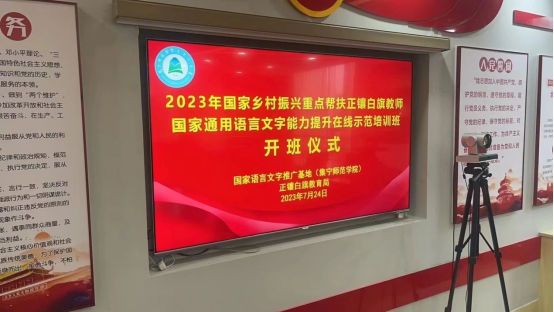 7月24日,国家语言文字推广基地(集宁师范学院)对口国家“乡村振兴”重点帮扶县——正镶白旗教师国家通用语言文字能力提升在线示范培训开班仪式在集宁师范学院和正镶白旗两地以“线上+线下”形式同步举行。国家语言文字推广基地(集宁师范学院)副主任、集宁师范学院党委委员、副校长拓俊杰,校语委副主任、文新院党总支书记、项目负责人张一弘,正镶白旗教育局副局长胡晓霞,正镶白旗教育局语委办负责人王东及全体培训教师和正镶白旗100名参训教师参加了开班式。仪式由张一弘主持。