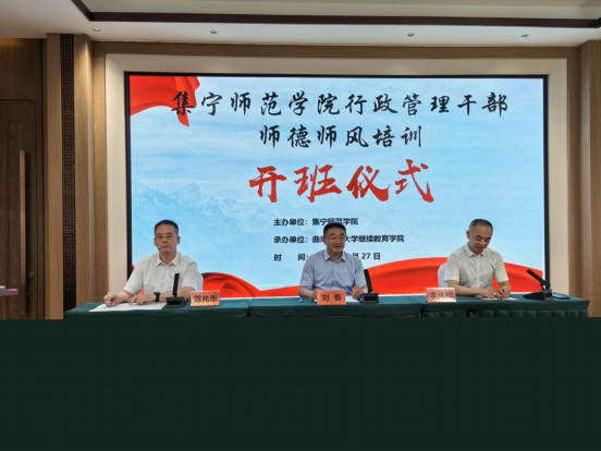 7月27日上午,举行了开班仪式开班仪式由曲阜师范大学继续教育学院院长范兆东主持。集宁师范学院党委副书记、校长刘春,曲阜师范大学副校长李兆祥出席开班式,并作重要讲话。李兆祥代表曲阜师范大学致欢迎词。他对参加此次培训的我校教师们表示热烈的欢迎,并就学校的办学历史、办学规模等情况做了简要介绍,同时对本次培训的日程安排进行了说明,并祝愿参训教师学有所得,学用结合,边学边思,满载而归!