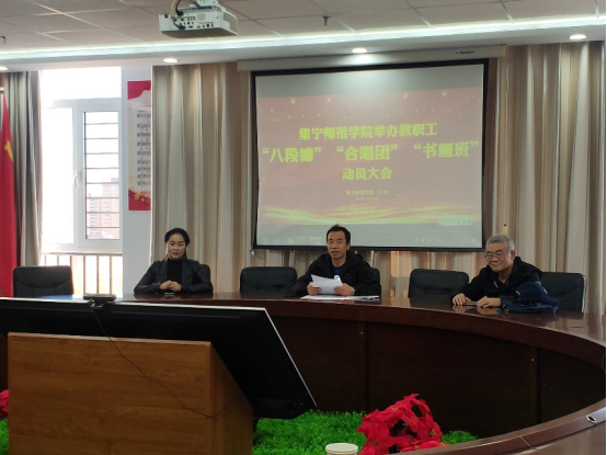 为秉持传承和弘扬中华传统书画、音乐艺术,提升广大教职工的艺术修养、审美情趣,为提升教职工健康水平建设健康美丽校园,学校工会于10月13日下午在泉山校区逸夫楼701活动室召开集宁师范学院教职工“八段锦”、“合唱”、“书画”活动动员会,校工会主席焦俊亮主持会议。