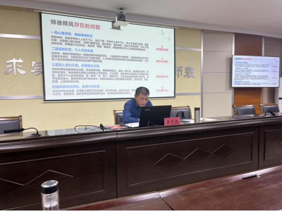 李景杰从“师德师风的内涵解读”“师德师风存在的问题”“师德师风的养成路径”等方面进行了阐释,详细解析了教师、师德、师风三者之间的联系,深刻剖析了师德师风存在的问题,进一步阐明了如何加强师德师风建设的方式方法,他希望全体教职工牢固树立底线意识,并提出了几点要求:一是要以政治引领筑牢思想根基;二是要以仁爱之心牵引行为规范;三是要以陶冶情操锤炼个人素养;四是要以知法明纪强化自我约束。