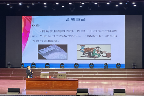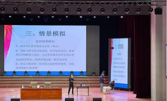 禁毒大队乌兰警官详细讲解了毒品的种类以及毒品的危害。为了让同学们更加直观地了解毒品相关的部分罪名成立的条件,校园安全志愿者协会刘波、巩成鑫等进行了情景模拟,生动形象展现了毒品对个人、家庭和社会的毁灭性影响。乌兰警官的讲解精彩纷呈,通过深入浅出的案例分析和数据统计,揭示了禁毒工作的必要性和紧迫性。同时告诫大家,毒品问题已经成为全球性的灾难,不仅危害个人和家庭,更威胁到社会的稳定和国家的发展,必须果断采取措施打击毒品犯罪,保护人民的生命财产安全。