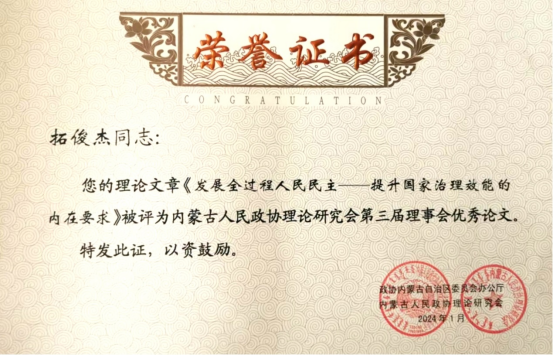 我校党委委员、副校长拓俊杰教授作为自治区政协理论研究会研究员执笔的理论文章《发展全过程人民民主——提升国家治理效能的内在要求》被评为内蒙古人民政协理论研究会第三届理事会优秀论文。