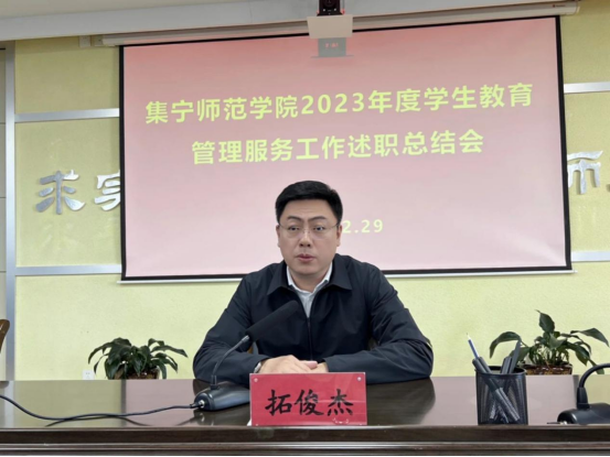 为全面系统地梳理总结2023年度学生工作重点任务完成情况,总结典型经验,查找工作中的不足、存在的问题及下一步努力方向,2024年2月29日,集宁师范学院召开2023年度学生教育管理服务工作述职总结大会。二级学院分管学生工作副书记、团总支书记、学工办主任、专职辅导员,学生工作部(学生处)科级以上人员参加了大会。会议由党委委员、副校长拓俊杰主持。