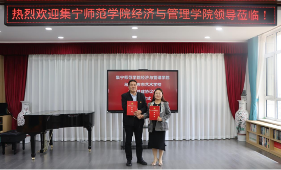 苗雯娟与胡伟绩签署《集宁师范学院经济与管理学院与乌兰察布市艺术学校党建共建协议书》。