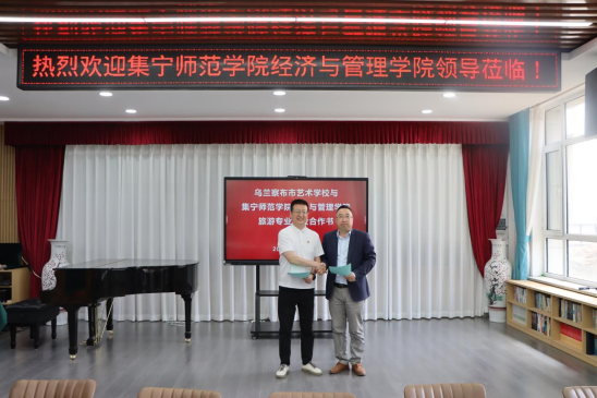张伟与郗存德签署《乌兰察布市艺术学校与集宁师范学院经济与管理学院旅游专业建设合作书》。