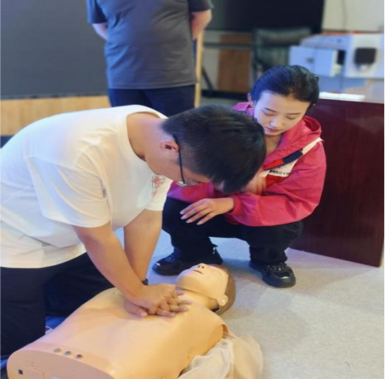 在实操环节,培训老师利用模拟人从环境评估、了解病员伤情、呼叫救援、调整体位、判断呼吸、胸外按压、人工呼吸等方面做了心肺复苏现场示范,师生们积极互动,参与模拟演练。培训师对操作步骤、动作要点等进行了指导。耐心纠正师生们实操过程中不规范和错误手法,让在场师生很快掌握了基本操作要领。