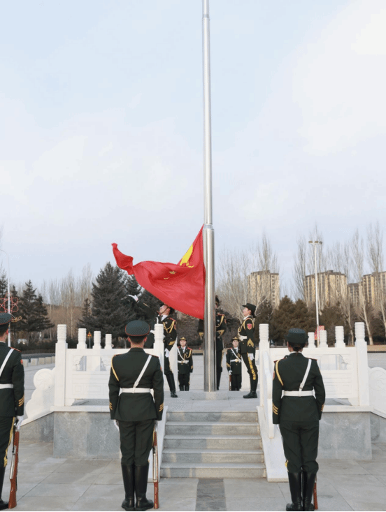 在激昂的《义勇军进行曲》中,英姿飒爽的国旗护卫队迈着铿锵有力的步伐护送国旗走向升旗台,伴随着雄壮的国歌声,鲜艳的五星红旗冉冉升起,全体师生肃立注目,表达对祖国的无限热爱和崇高敬意。