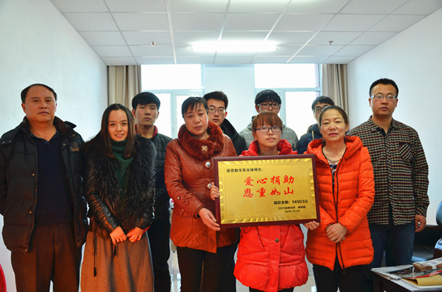 近日,数学系党总支组织全体师生开展了为郝艳霞同学献爱心活动。郝艳霞是数学系2013级数学与应用数学一班的学生,生活在一个重组家庭。61岁的父亲不幸患上喉癌,无钱医治。为救病重的父亲,给父亲筹钱治病,郝艳霞同学准备辍学打工。为帮助郝艳霞解决生活上的困难且顺利完成学业,数学系党总支组织了捐款活动,师生累计捐款金额达14903元。1月5日下午,在泉山校区逸夫楼,数学系领导和师生代表慰问了郝艳霞母亲,并将善款交到了郝艳霞母亲的手里。