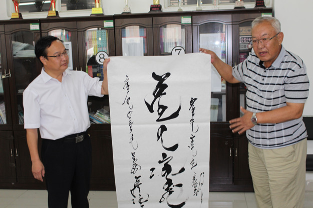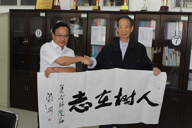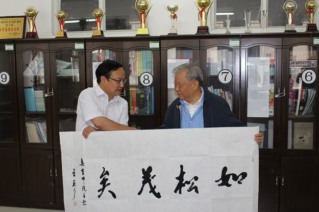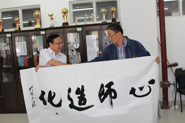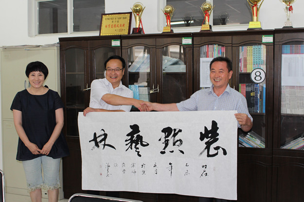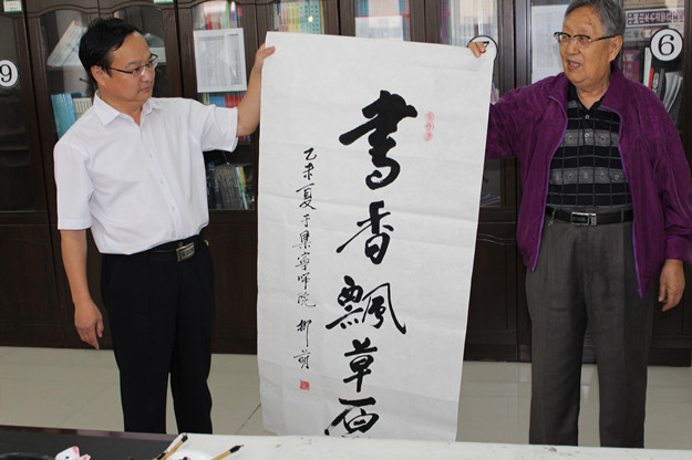 中国作协作家采风团先后参观考察了我校白海校区、泉山校区,赵海忠向采风团作家们介绍了学校的发展历史和现实状况,作家们对我校的办学条件给予了高度评价,王巨才用《诗经》的“如松茂矣”予以形容。作家们应邀欣然挥笔留下墨宝,表达对我校取得的成绩的高度赞赏和对学校未来发展的殷切希望。赵海忠代表学校接受了作家们的书法题赠并表示真诚感谢。