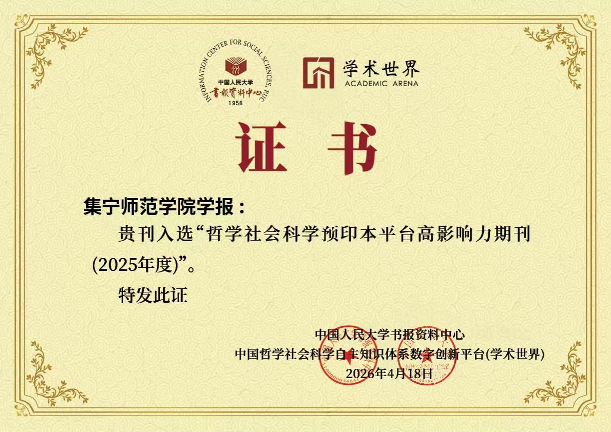 4月18日,中国人民大学书报资料中心、中国哲学社会科学自主知识体系数字创新平台(学术世界)联合发布了《哲学社会科学预印本平台高影响力论文、期刊评价研究报告(2025年度)》,《集宁师范学院学报》入选“哲学社会科学预印本平台高影响力期刊(2025年度)”百强名单。