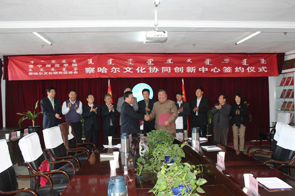 签约仪式结束后,与会人员进行了座谈交流。座谈会上,双方领导认为,察哈尔蒙古族历史悠久、文化灿烂、底蕴深厚,表示完全有义务、有责任,挖掘、研究、传承博大精深的察哈尔文化,全力支持察哈尔文化协同创新中心的各项工作。双方表示,以“察哈尔文化传承创新”为基础,以“集宁师范学院察哈尔文化研究所和察哈尔右翼后旗察哈尔文化研究促进会”为平台,以研发察哈尔蒙古文化为目标,以资源共享、互惠互利、长期稳定、共谋发展为合作原则,遵循“立足民族文化、携手地方行业协会、服务企业实体、成就文化传承创新”的校地合作机制,建立校地双方长期紧密的合作关系。