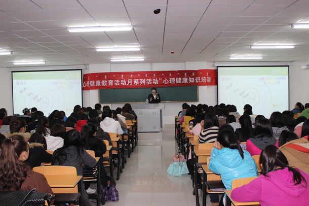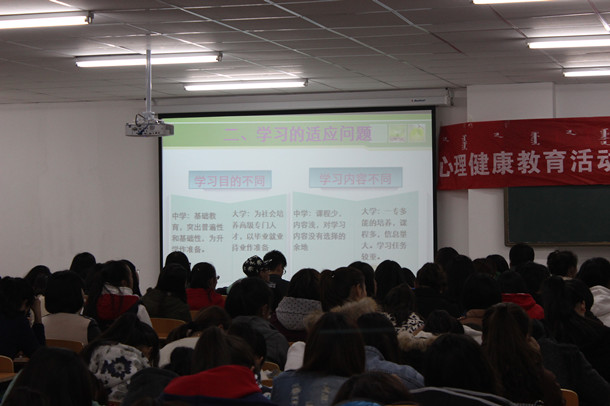10月11日下午,大学生心理健康知识讲座在白海校区举办。心理健康知识讲座是我校大学生心理健康教育系列活动之一和入学教育重要一环,我校心理健康教育与咨询中心邀请思政教学部晓荣老师作了题为《关于适应大学生活 确立新的目标》的讲座。白海校区2014级新生共300余人聆听了讲座。