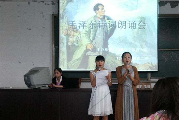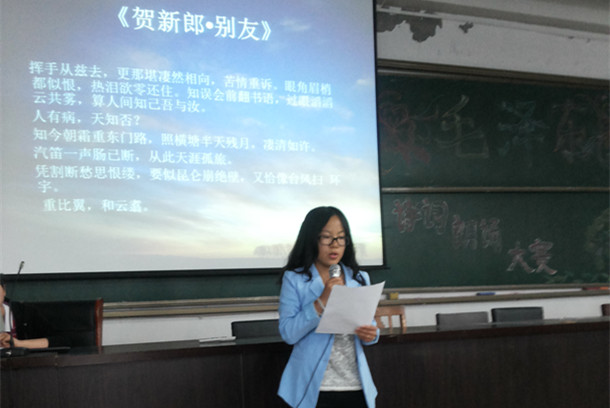 6月11日下午,中文系在主教楼举办“踏寻伟人的足迹——毛泽东诗词朗诵”大赛,思政教学部温馨、中文系王维新担任大赛指导教师。